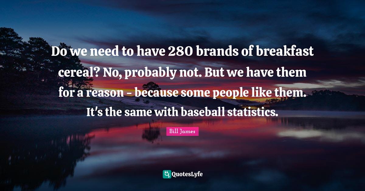 This page presents the quote "Do we need to have 280 brands of breakfast cereal? No, probably not. But we have them for a reason - because some people like them. It's the same with baseball statistics.". Author of this quote is Bill James. This quote is about cereal, breakfast cereal, people, reason, statistics, baseball, brands,.