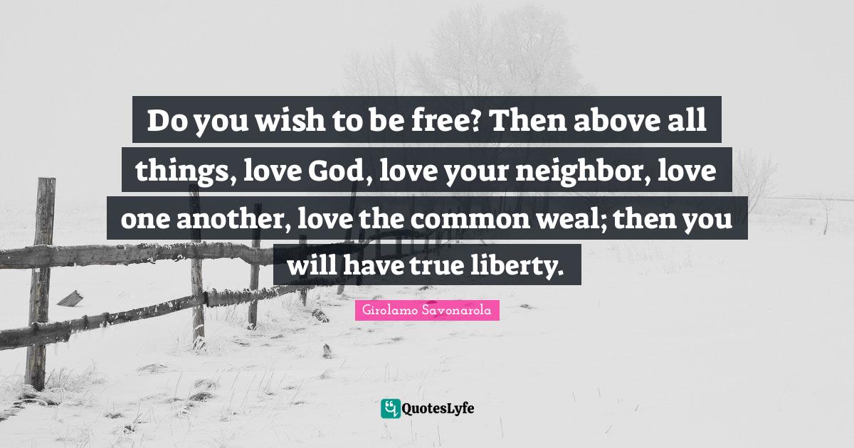 This page presents the quote "Do you wish to be free? Then above all things, love God, love your neighbor, love one another, love the common weal; then you will have true liberty.". Author of this quote is Girolamo Savonarola. This quote is about love, love one another, christian, god, all things, common, wish, neighbor, liberty,.
