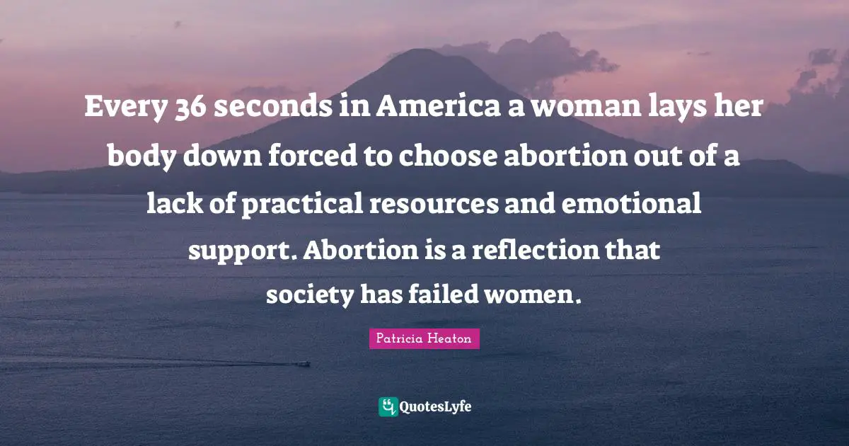 This page presents the quote "Every 36 seconds in America a woman lays her body down forced to choose abortion out of a lack of practical resources and emotional support. Abortion is a reflection that society has failed women.". Author of this quote is Patricia Heaton. This quote is about seconds, support, abortion, body, lays, resources, women, america, emotional,.
