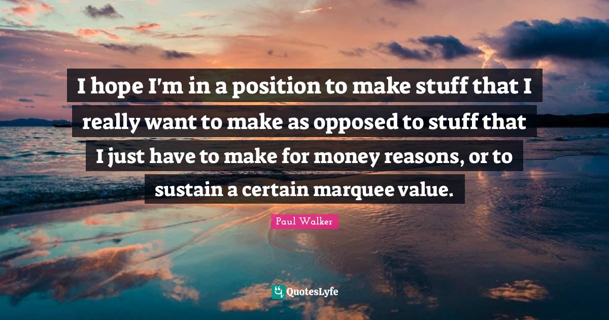 This page presents the quote "I hope I'm in a position to make stuff that I really want to make as opposed to stuff that I just have to make for money reasons, or to sustain a certain marquee value.". Author of this quote is Paul Walker. This quote is about money, position, stuff, reason, marquee, want, certain, hope,.