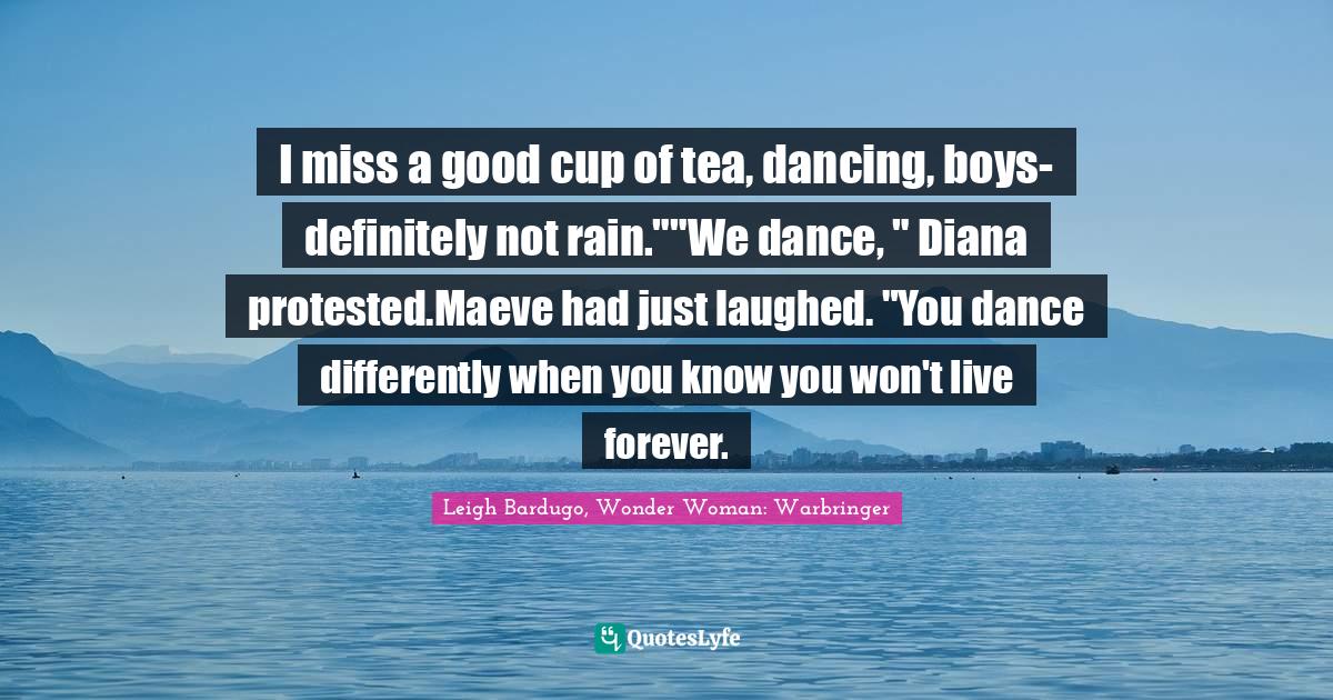 This page presents the quote "I miss a good cup of tea, dancing, boys- definitely not rain.""We dance, " Diana protested.Maeve had just laughed. "You dance differently when you know you won't live forever.". Author of this quote is Leigh Bardugo, Wonder Woman: Warbringer. .