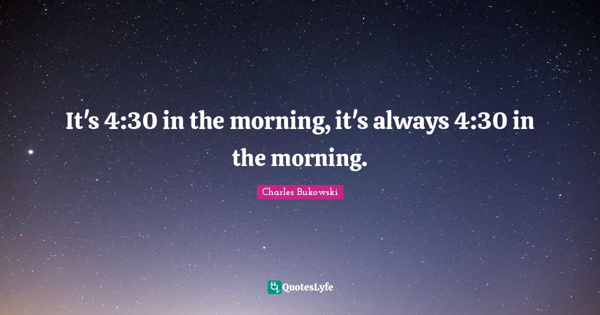This page presents the quote "It's 4:30 in the morning, it's always 4:30 in the morning.". Author of this quote is Charles Bukowski. This quote is about morning,.