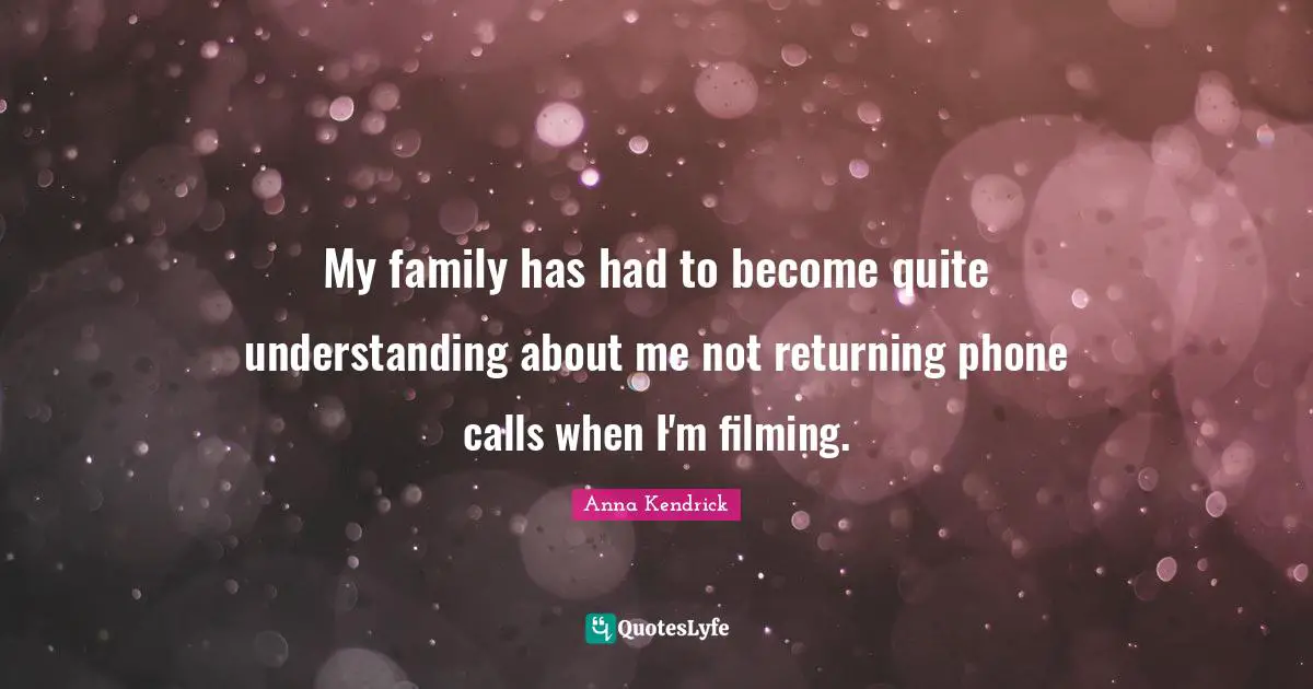 This page presents the quote "My family has had to become quite understanding about me not returning phone calls when I'm filming.". Author of this quote is Anna Kendrick. This quote is about me, filming, understanding,.