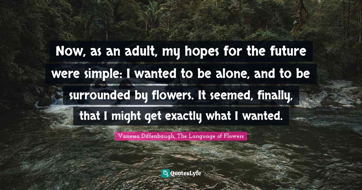 This page presents the quote "Now, as an adult, my hopes for the future were simple: I wanted to be alone, and to be surrounded by flowers. It seemed, finally, that I might get exactly what I wanted.". Author of this quote is Vanessa Diffenbaugh, The Language of Flowers. This quote is about hopes, aloneness, adulthood, wants, desires,.