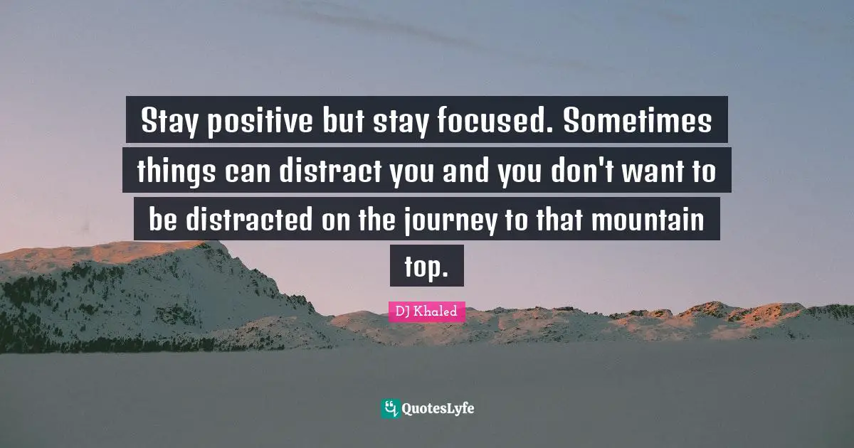 This page presents the quote "Stay positive but stay focused. Sometimes things can distract you and you don't want to be distracted on the journey to that mountain top.". Author of this quote is DJ Khaled. This quote is about mountain, distracted, stay positive, stay focused, want, journey, sometimes, mountain top,.