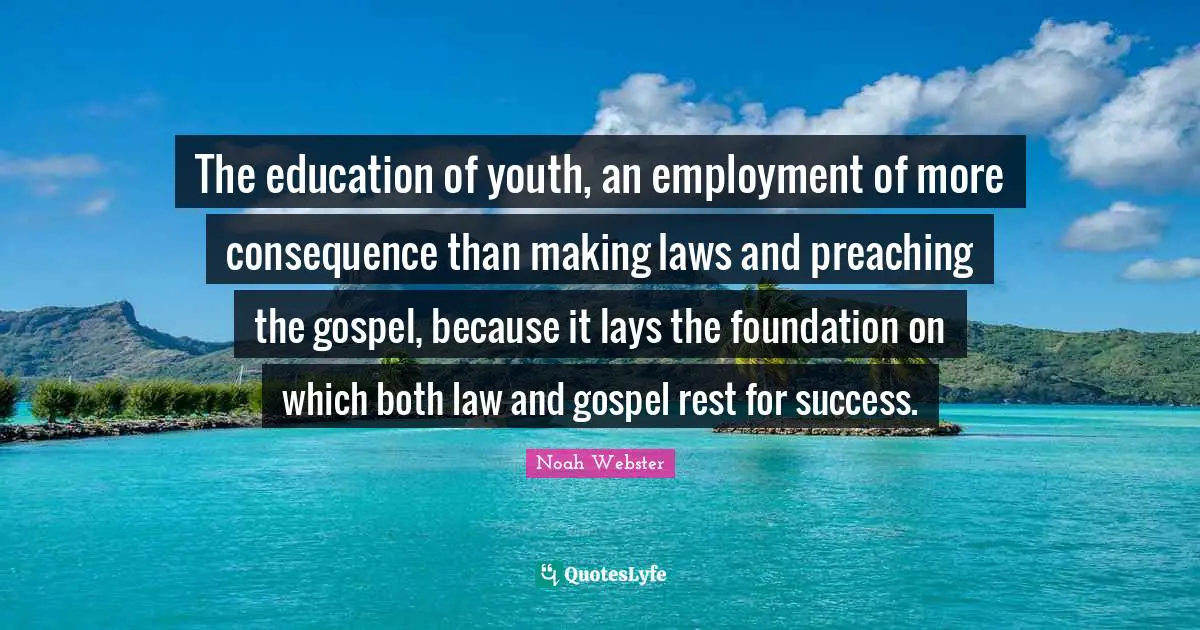 This page presents the quote "The education of youth, an employment of more consequence than making laws and preaching the gospel, because it lays the foundation on which both law and gospel rest for success.". Author of this quote is Noah Webster. This quote is about success, foundation, preaching the gospel, lays, education, employment, law, youth, consequence,.
