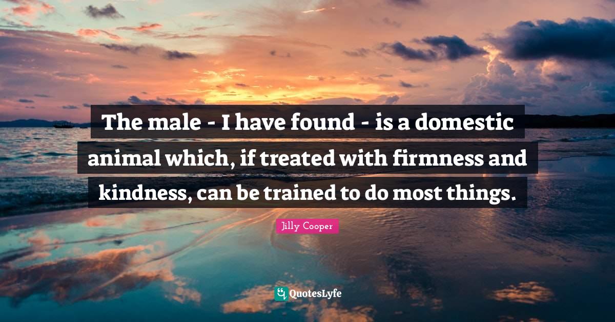 This page presents the quote "The male - I have found - is a domestic animal which, if treated with firmness and kindness, can be trained to do most things.". Author of this quote is Jilly Cooper. This quote is about animal, women, firmness, treated, found, kindness, marriage,.