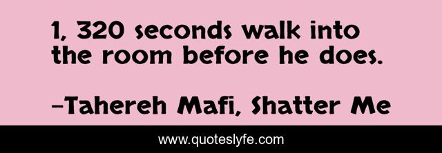 This page presents the quote "1, 320 seconds walk into the room before he does.". Author of this quote is Tahereh Mafi, Shatter Me. This quote is about ya, great-lines,.