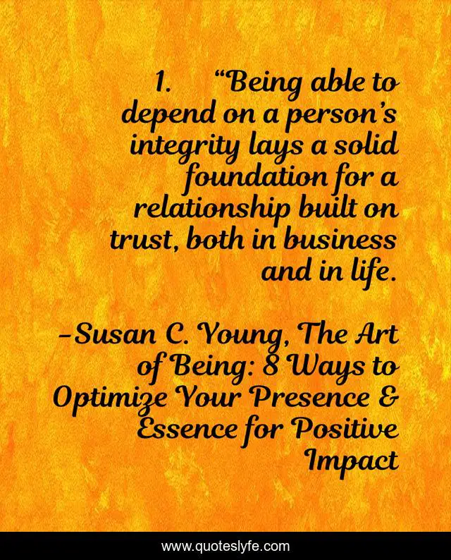 This page presents the quote "1. “Being able to depend on a person’s integrity lays a solid foundation for a relationship built on trust, both in business and in life.". Author of this quote is Susan C. Young, The Art of Being: 8 Ways to Optimize Your Presence & Essence for Positive Impact. This quote is about confidence, susan-young, relationship, communication-skills, communication, first-impressions, authenticity, trust, integrity,.