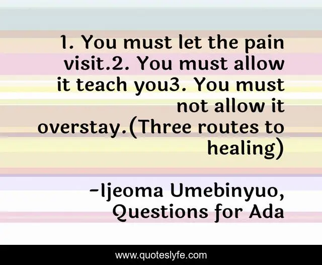 This page presents the quote "1. You must let the pain visit.2. You must allow it teach you3. You must not allow it overstay.(Three routes to healing)". Author of this quote is Ijeoma Umebinyuo, Questions for Ada. This quote is about moving-forward, pain, healing,.