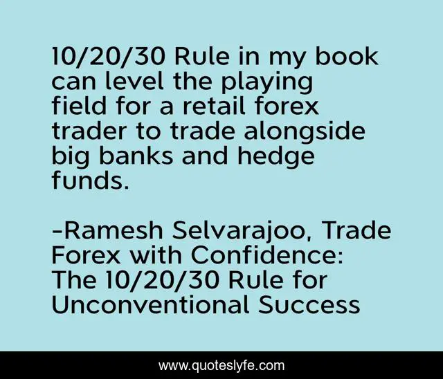 This page presents the quote "10/20/30 Rule in my book can level the playing field for a retail forex trader to trade alongside big banks and hedge funds.". Author of this quote is Ramesh Selvarajoo, Trade Forex with Confidence: The 10/20/30 Rule for Unconventional Success. This quote is about fx, forex, markets, business, trade,.