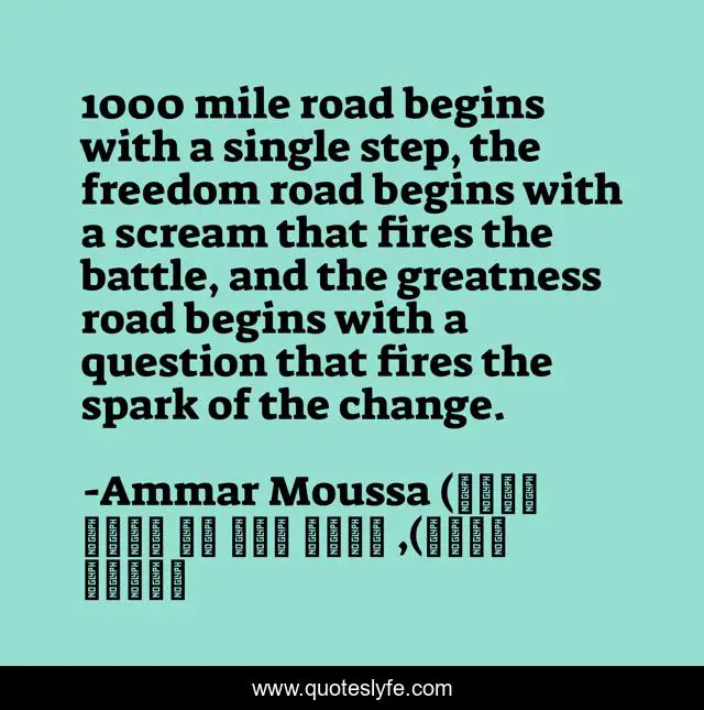 This page presents the quote "1000 mile road begins with a single step, the freedom road begins with a scream that fires the battle, and the greatness road begins with a question that fires the spark of the change.". Author of this quote is Ammar Moussa (عمار موسى), رحلة إلى ما وراء القمة. This quote is about freedom, spark, road, greatness,.