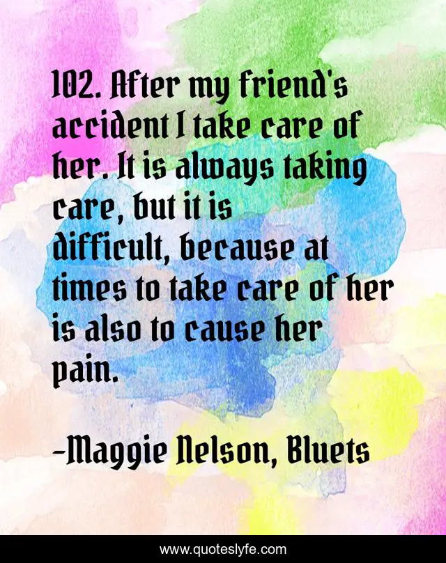This page presents the quote "102. After my friend's accident I take care of her. It is always taking care, but it is difficult, because at times to take care of her is also to cause her pain.". Author of this quote is Maggie Nelson, Bluets. This quote is about caring, friendship, pain,.