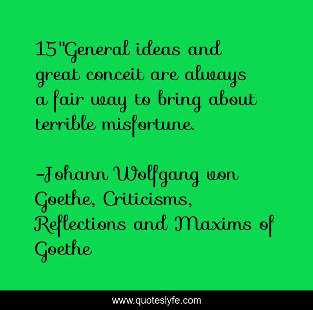 This page presents the quote "15"General ideas and great conceit are always a fair way to bring about terrible misfortune.". Author of this quote is Johann Wolfgang von Goethe, Criticisms, Reflections and Maxims of Goethe. This quote is about ideas, goethe, concepts,.