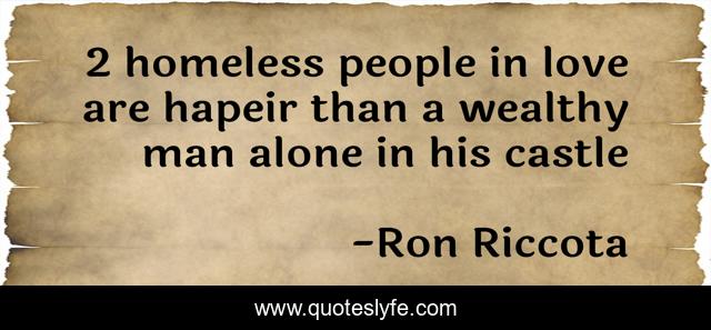 This page presents the quote "2 homeless people in love are hapeir than a wealthy man alone in his castle". Author of this quote is Ron Riccota. .
