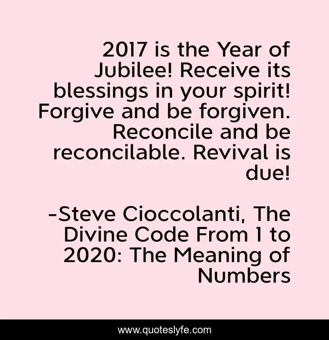 This page presents the quote "2017 is the Year of Jubilee! Receive its blessings in your spirit! Forgive and be forgiven. Reconcile and be reconcilable. Revival is due!". Author of this quote is Steve Cioccolanti, The Divine Code From 1 to 2020: The Meaning of Numbers. This quote is about christian, jewish, christianity, hebrew, prophecy, end-times,.