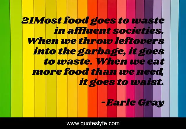 This page presents the quote "21Most food goes to waste in affluent societies. When we throw leftovers into the garbage, it goes to waste. When we eat more food than we need, it goes to waist.". Author of this quote is Earle Gray. This quote is about food, obesity, waste, hunger,.