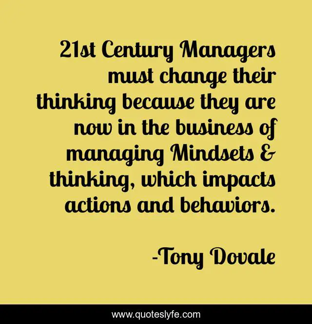 This page presents the quote "21st Century Managers must change their thinking because they are now in the business of managing Mindsets & thinking, which impacts actions and behaviors.". Author of this quote is Tony Dovale. This quote is about growth, mindsets, optimism, performane, organisational-culture, tony-dovale, values, leadership, attitudes,.