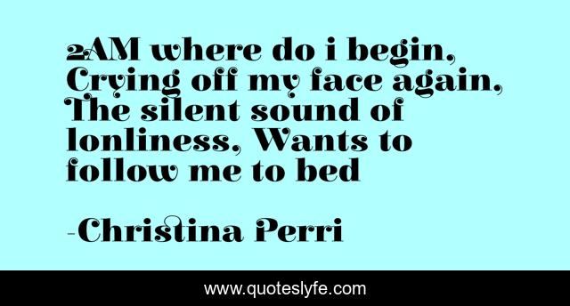 This page presents the quote "2AM where do i begin, Crying off my face again, The silent sound of lonliness, Wants to follow me to bed". Author of this quote is Christina Perri. This quote is about the-lonely, sad,.