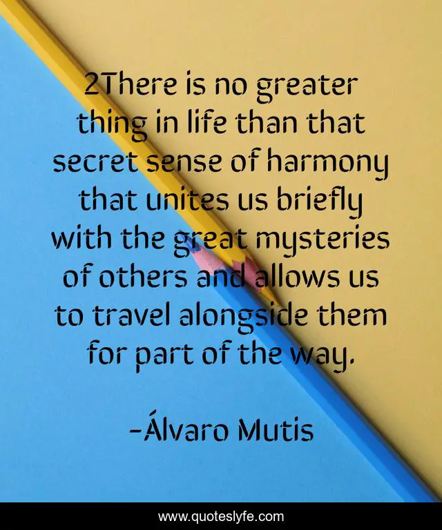 This page presents the quote "2There is no greater thing in life than that secret sense of harmony that unites us briefly with the great mysteries of others and allows us to travel alongside them for part of the way.". Author of this quote is Álvaro Mutis. This quote is about life, friendship, harmony,.
