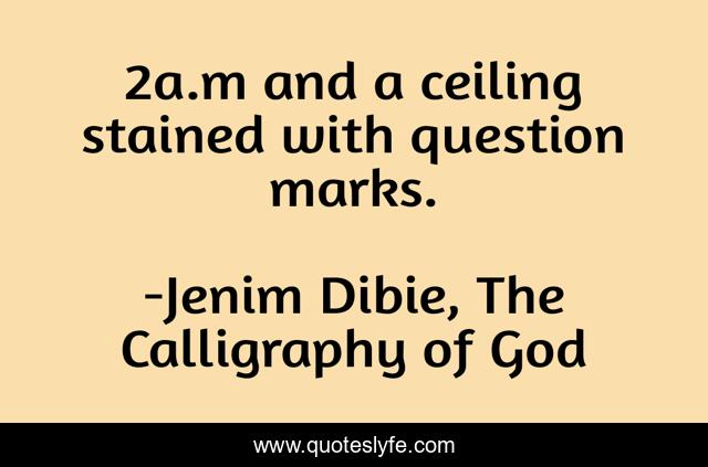This page presents the quote "2a.m and a ceiling stained with question marks.". Author of this quote is Jenim Dibie, The Calligraphy of God. This quote is about pain, jenim-dibie, lost, 2am, poetry, questions, poems,.