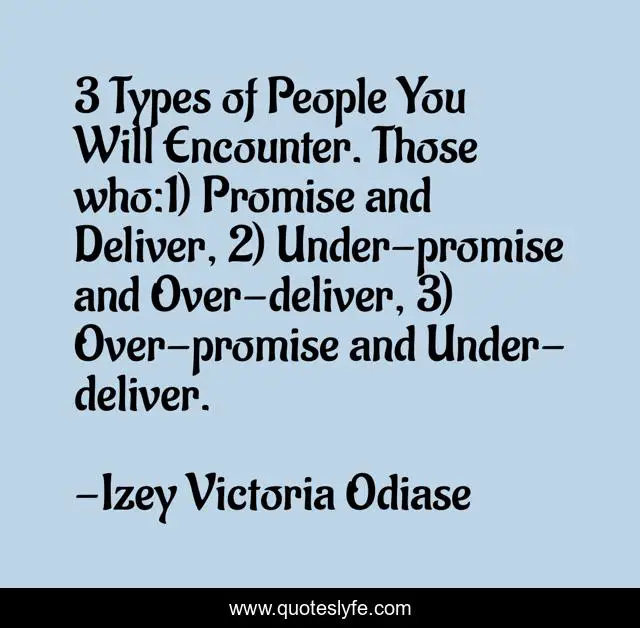 This page presents the quote "3 Types of People You Will Encounter. Those who:1) Promise and Deliver, 2) Under-promise and Over-deliver, 3) Over-promise and Under-deliver.". Author of this quote is Izey Victoria Odiase. This quote is about relationships, psychology, relationship, people, marketing, sales, promise, trust, friendship,.