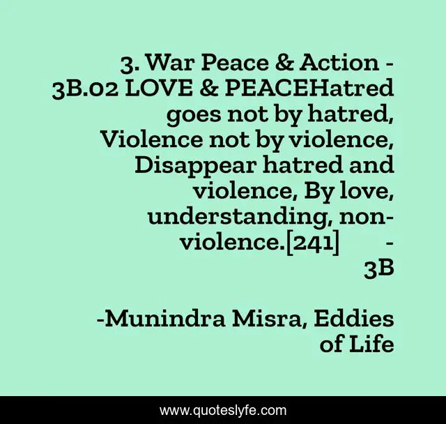 This page presents the quote "3. War Peace & Action - 3B.02 LOVE & PEACEHatred goes not by hatred, Violence not by violence, Disappear hatred and violence, By love, understanding, non-violence.[241] - 3B". Author of this quote is Munindra Misra, Eddies of Life. This quote is about nonviolence, peace, love, violence, understanding, action, hatred, war, affection,.