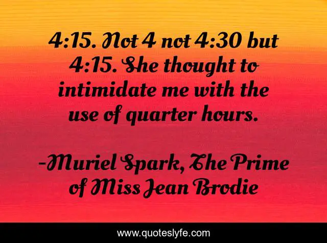 This page presents the quote "4:15. Not 4 not 4:30 but 4:15. She thought to intimidate me with the use of quarter hours.". Author of this quote is Muriel Spark, The Prime of Miss Jean Brodie. .