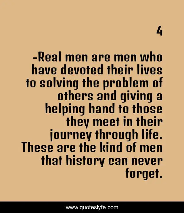 "Real men are men who have devoted their lives to solving the problem of others and giving a helping hand to those they meet in their journey through life. These are the kind of men that history can never forget. Quotes." Quoteslyfe.com, 2025. Sun. 07 Dec. 2025. <https://www.quoteslyfe.com/quote/4-174493>.