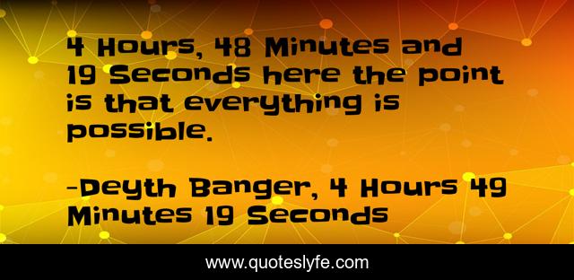 This page presents the quote "4 Hours, 48 Minutes and 19 Seconds here the point is that everything is possible.". Author of this quote is Deyth Banger, 4 Hours 49 Minutes 19 Seconds. This quote is about possible, here, point,.