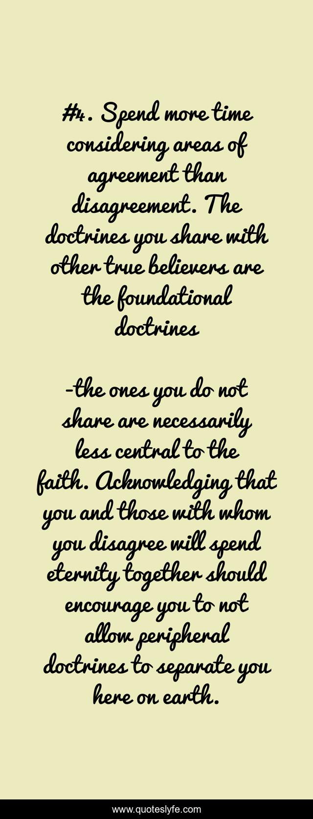 This page presents the quote "#4. Spend more time considering areas of agreement than disagreement. The doctrines you share with other true believers are the foundational doctrines". Author of this quote is the ones you do not share are necessarily less central to the faith. Acknowledging that you and those with whom you disagree will spend eternity together should encourage you to not allow peripheral doctrines to separate you here on earth.. .