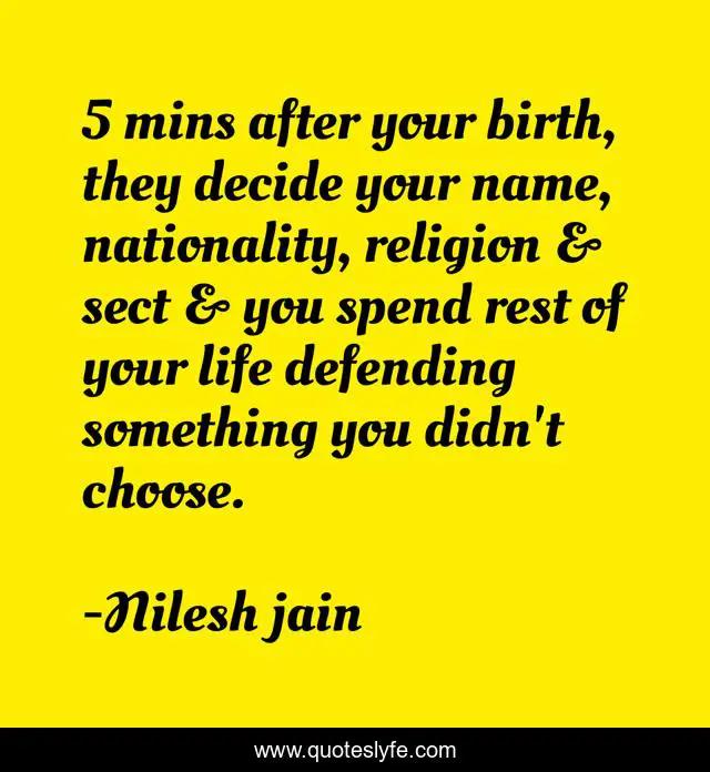 This page presents the quote "5 mins after your birth, they decide your name, nationality, religion & sect & you spend rest of your life defending something you didn't choose.". Author of this quote is Nilesh jain. This quote is about life, religion, defense, names, birth, nationalism, sect,.