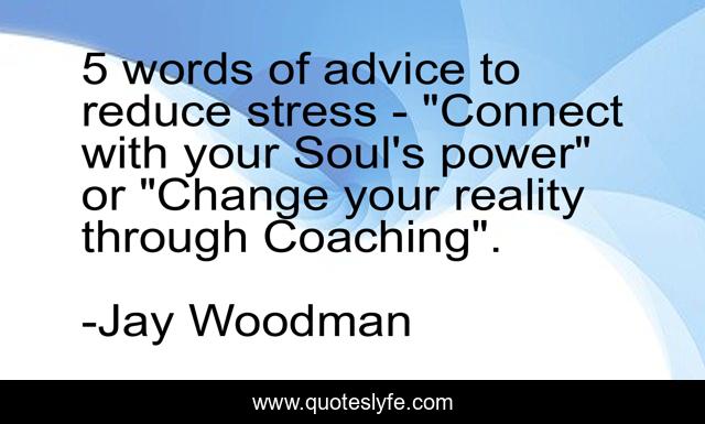 This page presents the quote "5 words of advice to reduce stress - "Connect with your Soul's power" or "Change your reality through Coaching".". Author of this quote is Jay Woodman. This quote is about stress, power, soul, reality, coaching, change,.