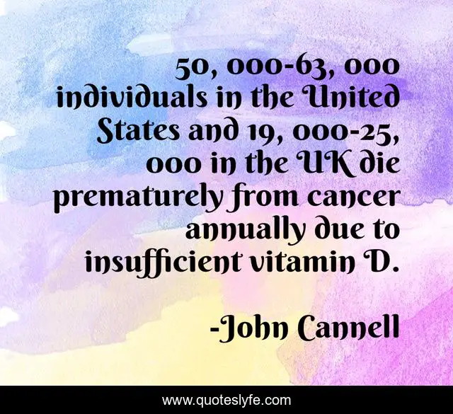 This page presents the quote "50, 000-63, 000 individuals in the United States and 19, 000-25, 000 in the UK die prematurely from cancer annually due to insufficient vitamin D.". Author of this quote is John Cannell. This quote is about diseases, cancer, science, deficiency, supplements, vitamin-d, health-and-fitness,.
