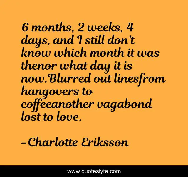 This page presents the quote "6 months, 2 weeks, 4 days, and I still don’t know which month it was thenor what day it is now.Blurred out linesfrom hangovers to coffeeanother vagabond lost to love.". Author of this quote is Charlotte Eriksson. This quote is about city, coffee, love, vagambond, broken-hearted, hangover, berlin, heartbreak, london,.