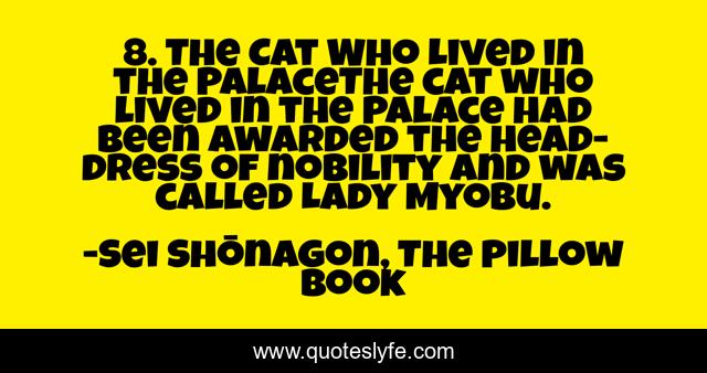 This page presents the quote "8. The Cat Who Lived in the PalaceThe cat who lived in the Palace had been awarded the head-dress of nobility and was called Lady Myobu.". Author of this quote is Sei Shōnagon, The Pillow Book. This quote is about court, palace, heian-culture, cat, empress, cats, heian-period, heian, lady,.