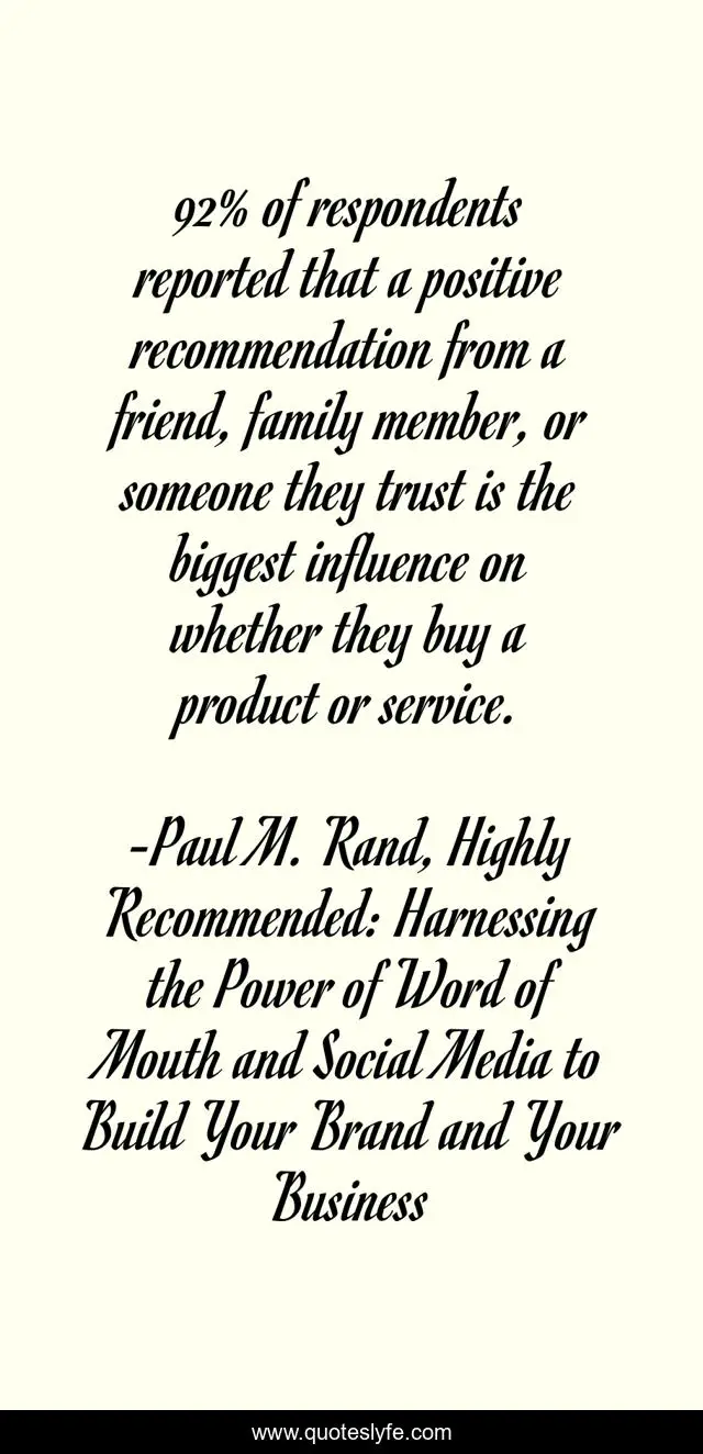 This page presents the quote "92% of respondents reported that a positive recommendation from a friend, family member, or someone they trust is the biggest influence on whether they buy a product or service.". Author of this quote is Paul M. Rand, Highly Recommended: Harnessing the Power of Word of Mouth and Social Media to Build Your Brand and Your Business. This quote is about product, branding, marketing, recommendation, social-media-behaviour, word-of-mouth,.
