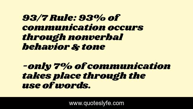 This page presents the quote "93/7 Rule: 93% of communication occurs through nonverbal behavior & tone". Author of this quote is only 7% of communication takes place through the use of words.. This quote is about overcoming fake talk: how to hold real conversations that create respect, and get results, john stoker, build relationships,.