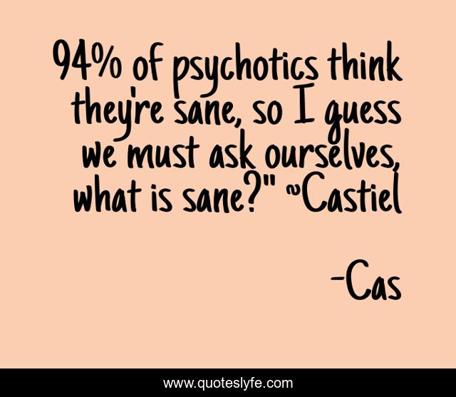 This page presents the quote "94% of psychotics think they're sane, so I guess we must ask ourselves, what is sane?" ~Castiel". Author of this quote is Cas. .
