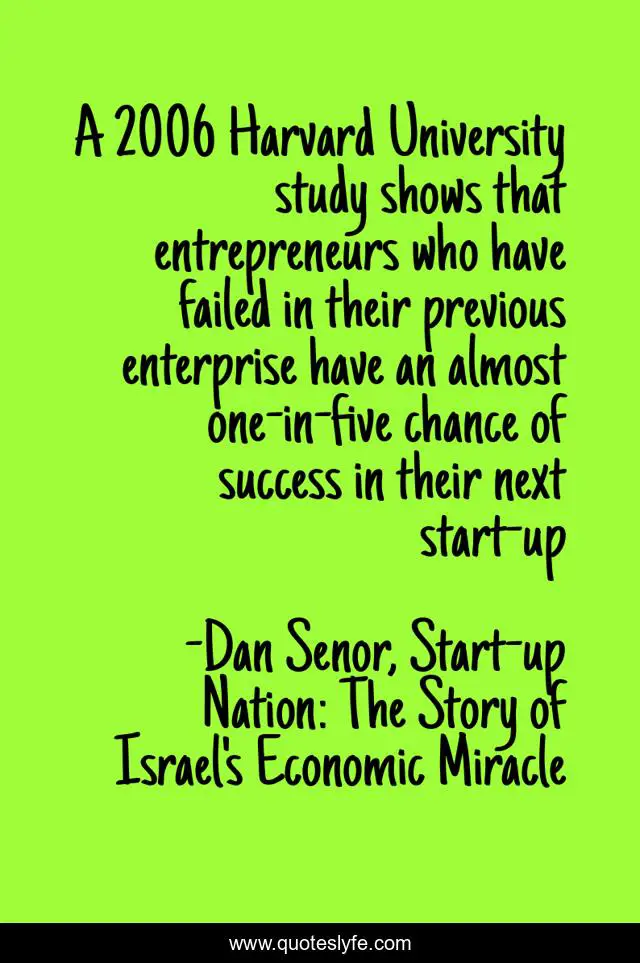 This page presents the quote "A 2006 Harvard University study shows that entrepreneurs who have failed in their previous enterprise have an almost one-in-five chance of success in their next start-up". Author of this quote is Dan Senor, Start-up Nation: The Story of Israel's Economic Miracle. This quote is about start-ups, entrepreneurship,.