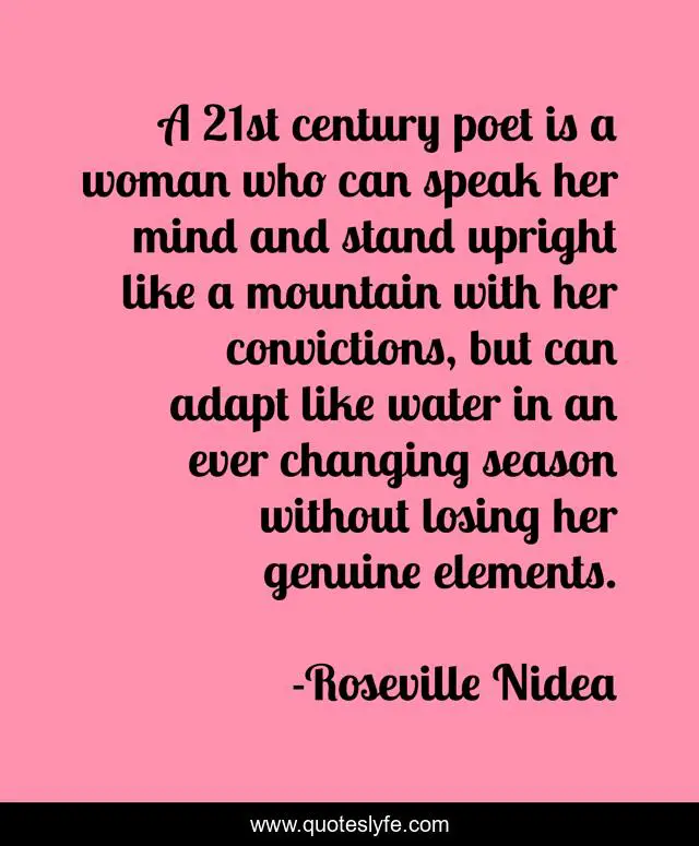 This page presents the quote "A 21st century poet is a woman who can speak her mind and stand upright like a mountain with her convictions, but can adapt like water in an ever changing season without losing her genuine elements.". Author of this quote is Roseville Nidea. This quote is about mountain, woman, words, conviction, non-fiction, quote, rights, mind, poets-and-poetry,.
