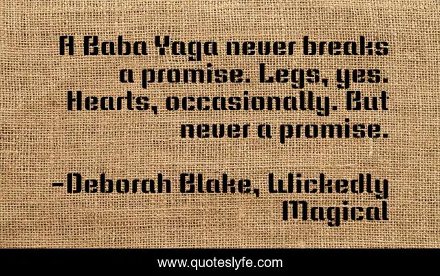 This page presents the quote "A Baba Yaga never breaks a promise. Legs, yes. Hearts, occasionally. But never a promise.". Author of this quote is Deborah Blake, Wickedly Magical. This quote is about magic, paranormal, dragons, fantasy, witches, fractured-fairy-tale,.