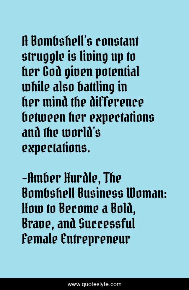 This page presents the quote "A Bombshell’s constant struggle is living up to her God given potential while also battling in her mind the difference between her expectations and the world’s expectations.". Author of this quote is Amber Hurdle, The Bombshell Business Woman: How to Become a Bold, Brave, and Successful Female Entrepreneur. This quote is about womens-inspirational, individuality, business-advice, business, success, personal-growth, life, women-empowerment, womens-strength,.