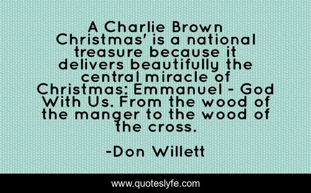 This page presents the quote "A Charlie Brown Christmas' is a national treasure because it delivers beautifully the central miracle of Christmas: Emmanuel - God With Us. From the wood of the manger to the wood of the cross.". Author of this quote is Don Willett. This quote is about god, wood, treasure,.