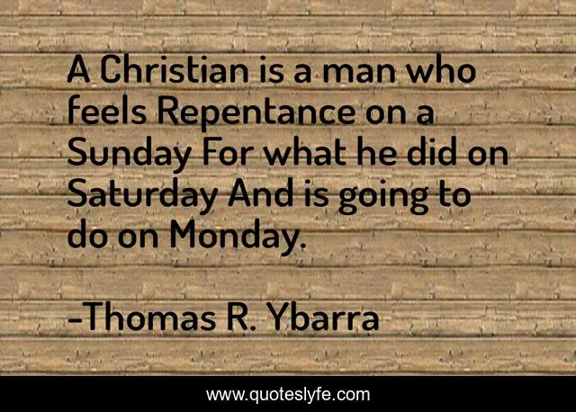 This page presents the quote "A Christian is a man who feels Repentance on a Sunday For what he did on Saturday And is going to do on Monday.". Author of this quote is Thomas R. Ybarra. This quote is about christians, christianity,.