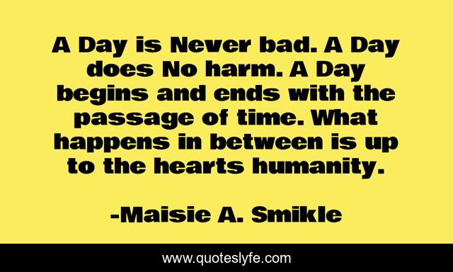 This page presents the quote "A Day is Never bad. A Day does No harm. A Day begins and ends with the passage of time. What happens in between is up to the hearts humanity.". Author of this quote is Maisie A. Smikle. .