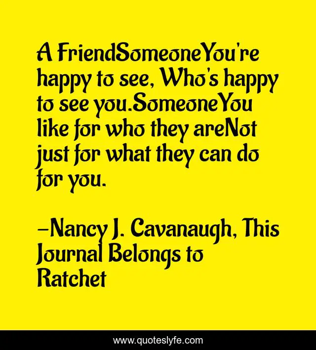"Nancy J. Cavanaugh, This Journal Belongs to Ratchet Quotes." Quoteslyfe.com, 2025. Fri. 05 Dec. 2025. <https://www.quoteslyfe.com/quote/A-FriendSomeoneYou-re-happy-to-see-Who-16639>.