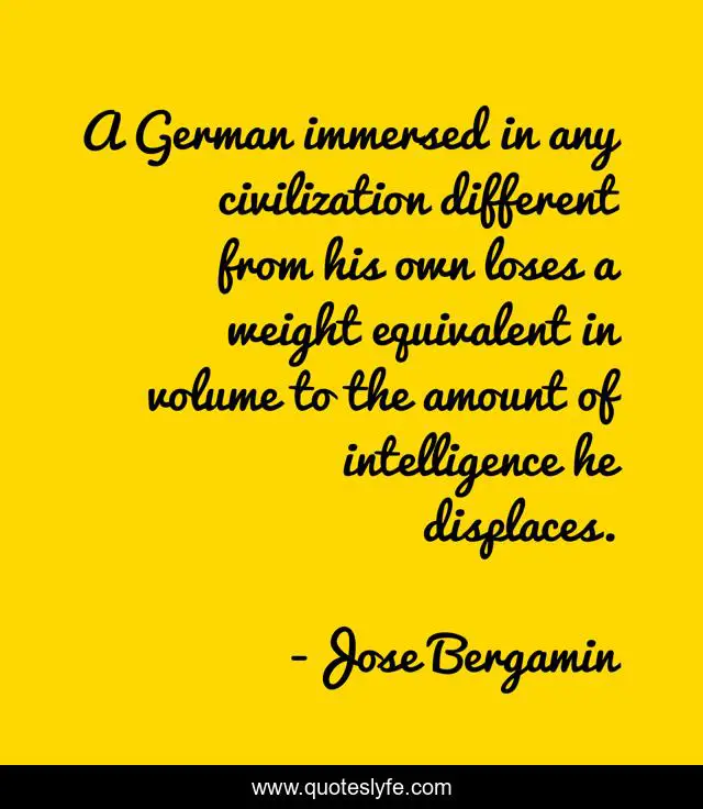 This page presents the quote "A German immersed in any civilization different from his own loses a weight equivalent in volume to the amount of intelligence he displaces.". Author of this quote is Jose Bergamin. This quote is about different, civilization,.