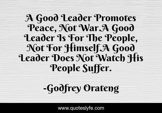 This page presents the quote "A Good Leader Promotes Peace, Not War.A Good Leader Is For The People, Not For Himself.A Good Leader Does Not Watch His People Suffer.". Author of this quote is Godfrey Orateng. This quote is about good, leader, peace,.