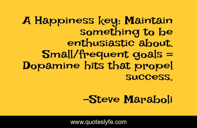 This page presents the quote "A Happiness key: Maintain something to be enthusiastic about. Small/frequent goals = Dopamine hits that propel success.". Author of this quote is Steve Maraboli. This quote is about happiness, goals, success, dopamine,.